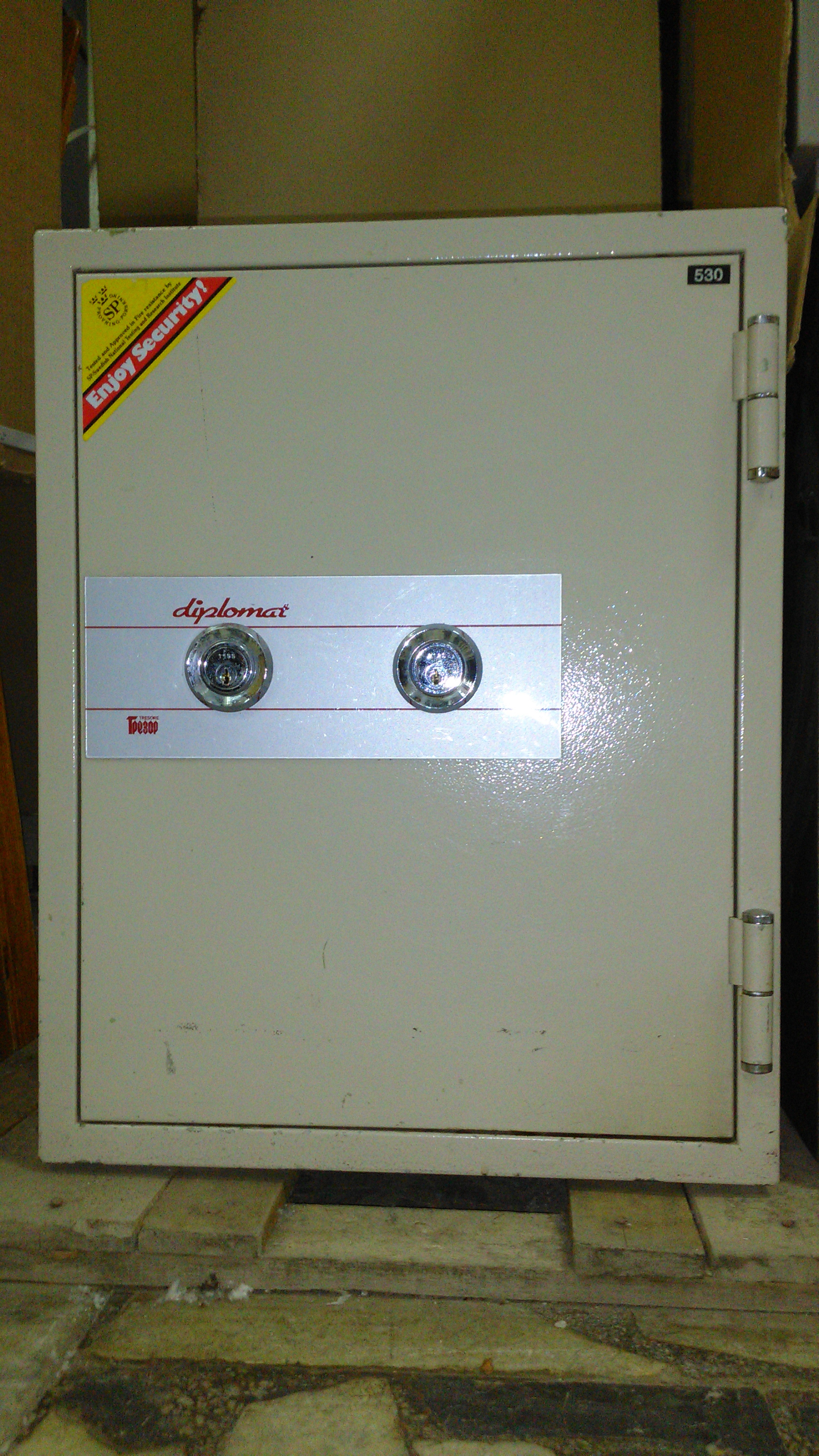 отделением(трейзер), находящимся внизу внутри сейфа. Запирается при помощи 2-х ключевых замков.